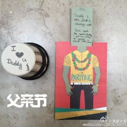 估計妳做這小作品的時候都不知道自己在干嘛更不知道這對我有多大的意義[兔子]但還是要謝謝妳的第一份父親節禮物,謝謝妳媽媽把妳帶來這世界。爸爸現在已經充滿力量,繼續掙錢去了[奥特曼]爸爸永遠愛妳[亲亲]祝天下的父親,父親節快樂[干杯]