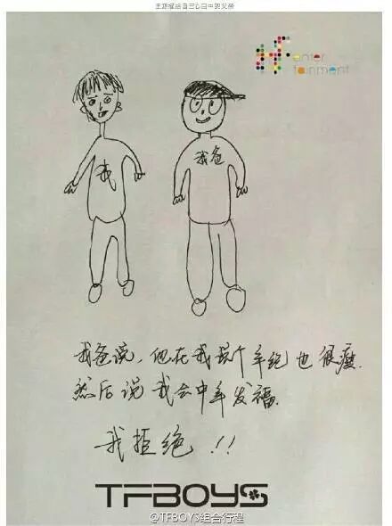 王源同学的字和画风都很随性。王爸爸和花轮同学同款发型。