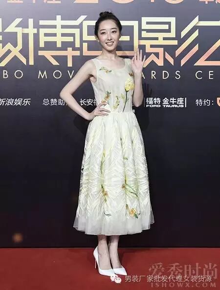蒋梦婕穿着立体花朵装饰的无袖长裙,少女范儿十足,穿上白色高跟鞋,简单清爽。