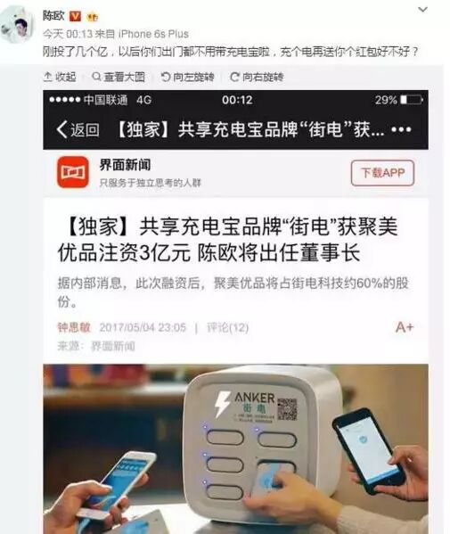 3天前,聚美优品宣布将以3亿元收购共享充电宝企业深圳街电科技有限公司的60%股权,陈欧将担任街电董事长。
