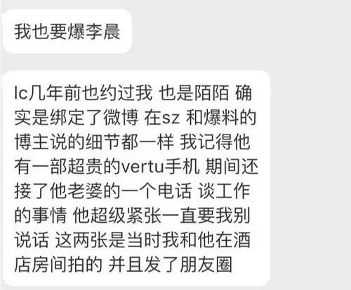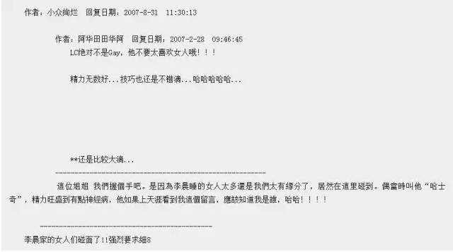 最早2006年,天涯一个有名的帖子《 八一八,有人和明星睡过觉的吗?》,评论中两个妹子,发现自己的明星炮友和对方的是同一个人,也就是李晨nic,还称呼他为“哈士奇”,意为精力旺盛… 可此次爆料的人说他细长… 哈哈,是同一个人吗~