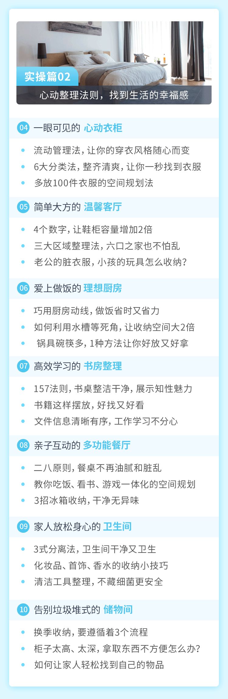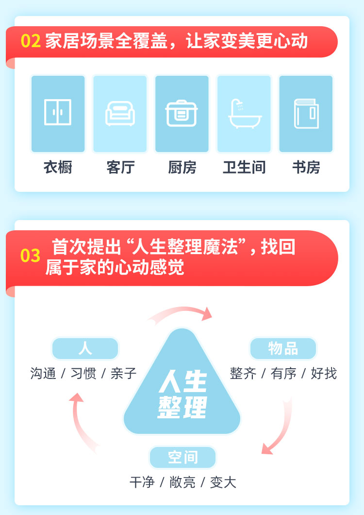 房子扩容8倍:按心动原则轻松取舍,找到碎片空间,收纳留下物品,省出20%地方给将新买的东西,小家越住越宽敞。 整洁不再乱:按集中固定+就近原则,给所有物品设定位置。东西摆放井然有序,一目了然。 生活井然有序:按空间规划+流动管理,做饭、穿衣、出门等,一秒找到所需物品,省时又省力。