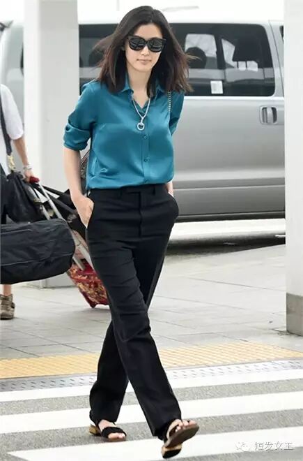 全智贤5月15日韩国仁川机场街拍:身着古驰 (Gucci) 2015秋冬系列衬衫+黑裤,背Gucci包 |