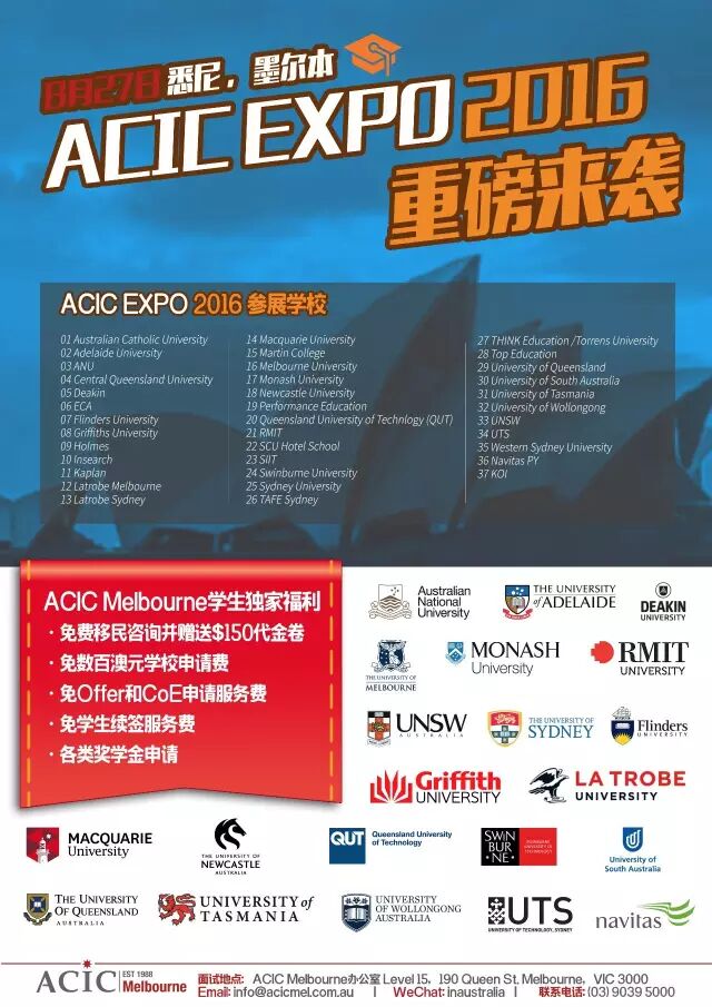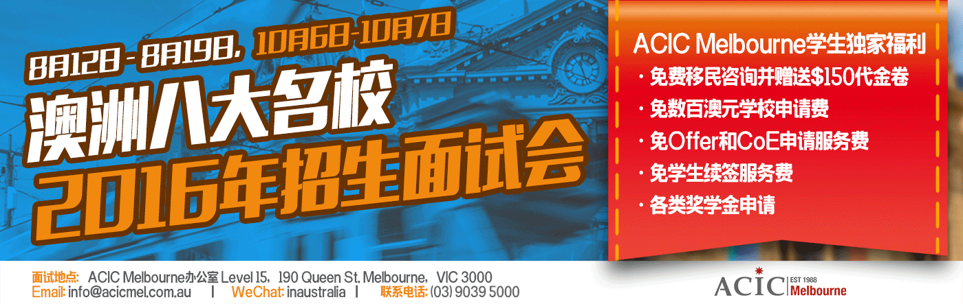 欲了解更多澳洲留学、移民资讯,ACIC Melbourne的专业教育顾问和移民顾问乐意为您提供免费咨询服务。咨询电话:03)9039 5000。
