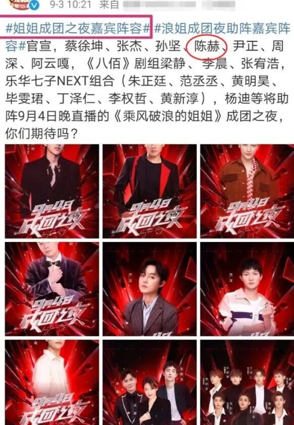 事情要从前两天说起,《乘风破浪的姐姐》的官博发文说邀请了陈赫做成团夜的主演嘉宾。