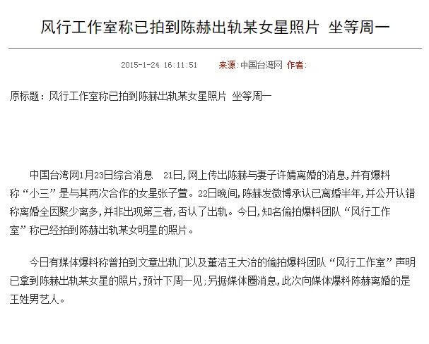 2015年年初,陈赫跟张子萱合作拍的剧开播,但是大名鼎鼎的风行很快就拍到了两人一同出游的照片,还放出“陈赫出轨张子萱,已和许婧离婚”的消息。
