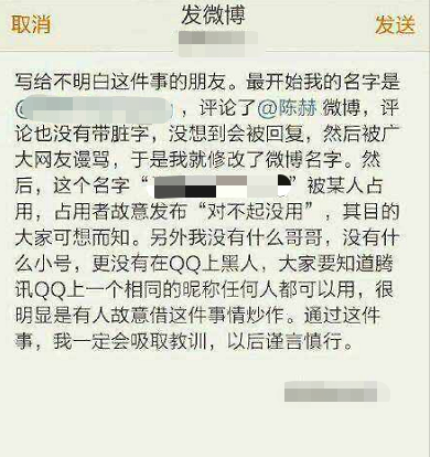 有意思的是,这名网友后来为了避免继续被攻击就改了名字,没想到又被别有用心的人给钻了空子,只好发微博澄清,自己没有蹭陈赫的热度,更没有挑事。