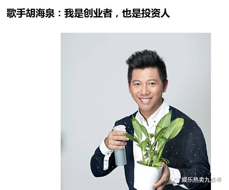 近两年胡海泉又开始进军投资界,成立了好几家投资管理公司,投资了不少项目,妥妥的在自己的履历和头衔上加上了“投资人”一项。