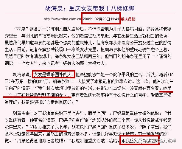 不过2009年胡海泉在接受重庆媒体采访时,公开承认过有个相恋多年的重庆女友,并把女友的父母称为“岳父岳母”。