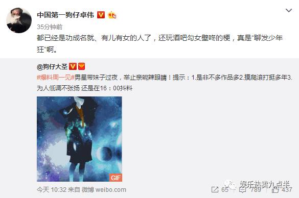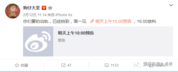 又是卓伟徒弟@狗仔大圣 在微博上预告,已经拍到了大家都很期待的出轨(谁在期待出轨?),会在周一16点放料。