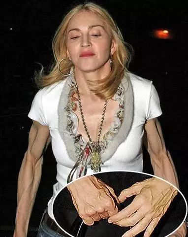 享誉全球的歌手麦当娜现已年近60,虽然脸部保养的很好,但是麦当娜的手已经不能用“鸡爪手”来形容了,简直就是“僵尸手”了。