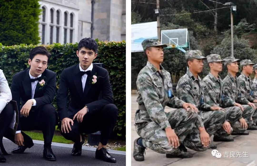 看刘昊然这次的伴郎合照你会发现,他采用的,是还挺标准的军姿蹲。