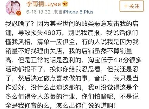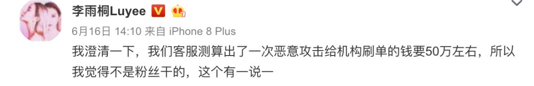 她说有人恶意攻击她的店铺,造成了很大的损失,还说一次攻击的成本要50万,应该不是粉丝干的。听这意思貌似指是薛之谦干的: