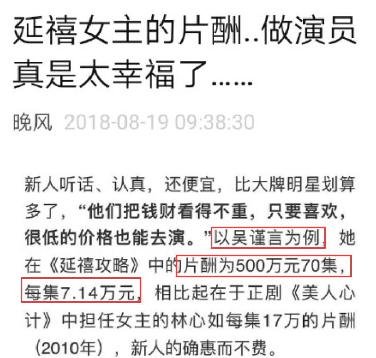 并且这次出演《延禧宫略》,因为属于十八线演员,几位主演中吴谨言的片酬也是最低的,一集仅7万而已,而据传,当时林心如主演《美人心计》的时候,单集片酬就已达17万,相比之下,“魏姐”的片酬真的是十分便宜了!