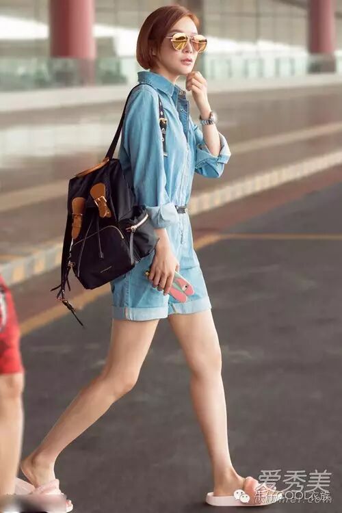 袁姗姗穿牛仔连体短裤配粉色拖鞋,一双美腿也是满养眼,背着黑色双肩包,洋溢青春活力。