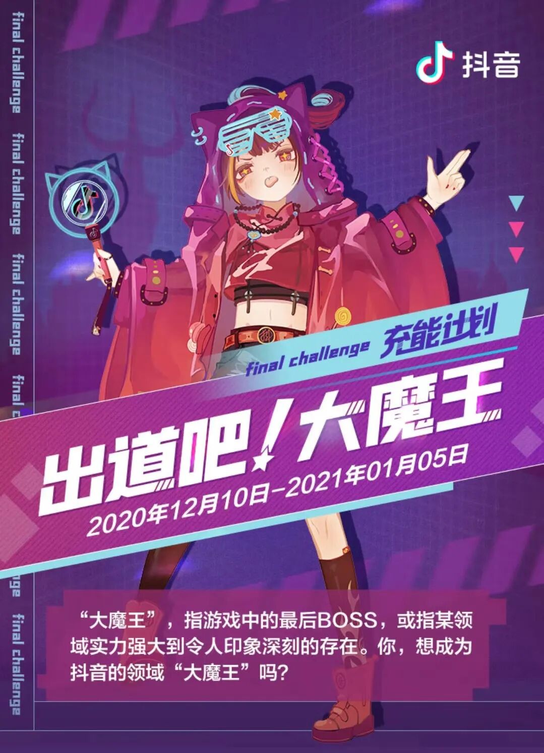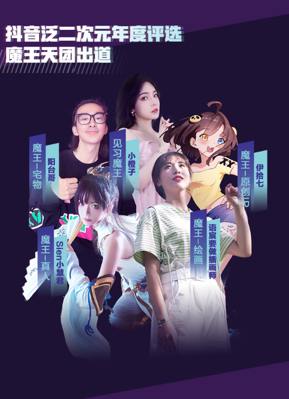 “出道吧大魔王”是抖音二次元领域“充能计划”活动之一,以直播为主要创作形式,为踊跃开播的泛二次元创作者提供了开屏、DOU+、专属BGM、定制出道曲等多形式的流量扶持,共计评选出涵盖原创IP、绘画、真人、宅物等几大赛道的多位“魔王”,以及涨粉最多的1位“见习魔王”,为不同领域的创作者提供“出道”机会。