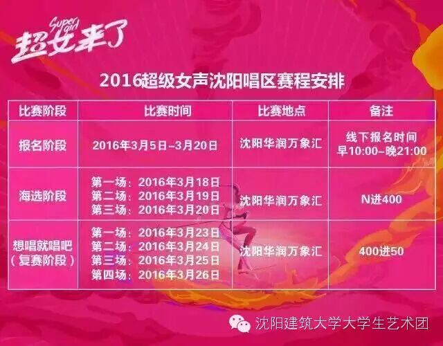 吴亦凡来啦!超女来啦!你准备好了吗? 内地男星 2016-03-13 19:00:07 95 创作不易,用心坚持,欢迎请BaGua喝几杯爱心咖啡!打赏并支持本文 打赏并删除本文 2016超级女声的报名已经持续好几天啦 今天小编有一个更加火爆的消息告诉大家 吴亦凡喊你来沈阳建筑大学报名超级女声了 听小编说 此处报名专属福利:专车免费护送参加海选的美女们到达比赛现场!!免去大家路程中的波折以及现场报名排队的忧桑。Ps:临校的美女们若想搭个顺风车,也可参与报名参赛哦。另外告诉大家一个秘密:参加海选的美女们可能会见到wuli凡凡本人哦!!!她们的今天将是你们的明天 ~用音乐再次点燃你的梦想~~~想唱就唱要唱的响亮~~~~~让你的歌声在春天唱响吧~~~~~~~如果你一讲蓄势待发,那就快来报名吧~~~~ 报名方式方式一:3月14日(周一)当天8:00~12:00 建大长廊C馆口 线下报名 方式二:3月14日(周一)8:00~3月18日(周五)18:00 线上报名 点击本文下方“阅读全文”即可Ps:海选当天(3月19日)专车免费护送大家沈阳建筑大学大学生艺术团联合会期待你的报名长按二维码关注 创作不易,用心坚持,欢迎请BaGua喝几杯爱心咖啡!打赏并支持本文 打赏并删除本文 感谢您的支持鼓励,我会继续努力的!文章地址:用户邮箱:打赏金额:USDT 请输入数字点击”去打赏“,即可进行打赏支持本文章哦 吴亦凡 发表评论