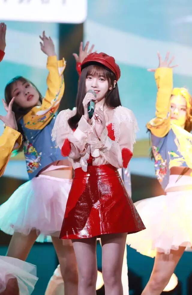 这不,这回我们的小个子星人代表鞠婧祎身穿一条红色皮质半身短裙,