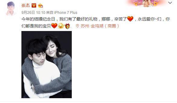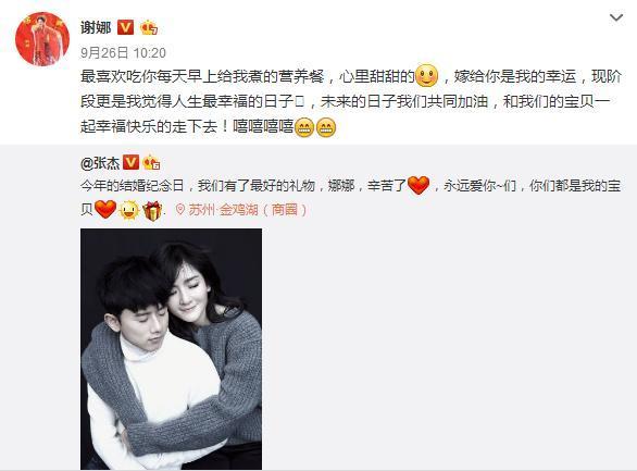2017年9月26日,谢娜张杰结婚纪念日这天,张杰发了条微博,和娜娜的甜蜜合影并配文道,“今年的结婚纪念日,我们有了最好的礼物,娜娜,辛苦了,永远爱你~们,你们都是我的宝贝。”