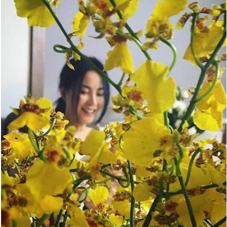 照片中,王菲躲在一丛黄花后面,笑容灿烂。
