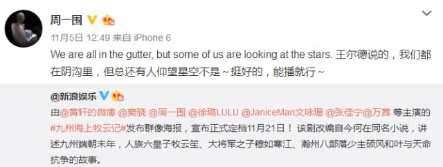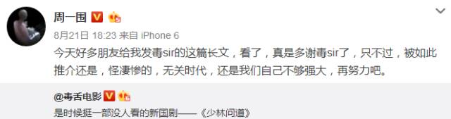 时隔一个月,毒舌电影以“挺一部没人看的新国剧”为标题,安利了这部冷剧。周一围转发了这个推荐微博,并用了“凄惨”二字。但他依旧没有抱怨其他,而把这些归结于自己不够强大。