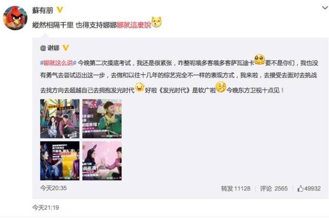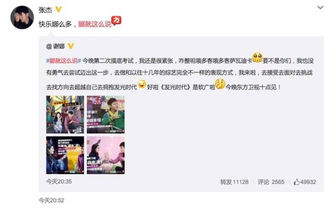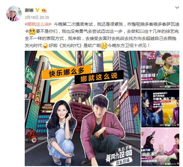 有了以往的主持经验和人脉积累,谢娜的这一档新节目也被好朋友们各路传播和支持。从何炅到范冰冰,从张杰到阿雅,每一次转发都再一次验证谢娜的好人缘。