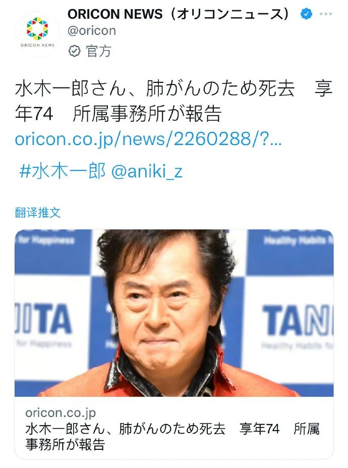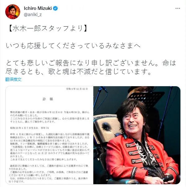 【讣告】据事务所的消息,日本知名歌手、JAM Project 创始人、“动画金曲帝王”水木一郎于12月6日下午6时50分(日本时间)因肺癌去世,享年74岁。水木一郎于2021年4月末时诊断出肺癌,之后反复住院出院,并尝试了放射与药物治疗,与病魔抗争了1年7个月,但最终还是在救护车运送之后,于本月6日在医院内去世。