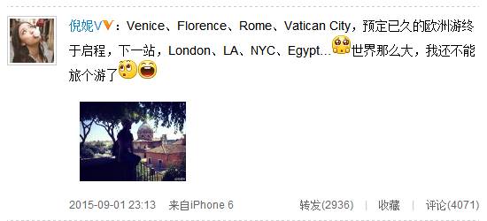 随便翻翻倪妮的微博就能看见许多美美的照片,给人一种很舒服的感觉,都说要找一个会照相的男朋友,但是照片中你的曲线也应该对得起男友的镜头吧!