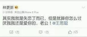 14年29号晚上23点17分林更新突然在微博上以老公相称“示爱”王思聪,在网友间引发轩然大波,随即王思聪发声称林更新微博被盗,而后者也于当日深夜和昨日上午连发微博谴责盗号者。