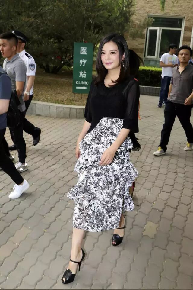 赵薇穿这条黑色印花拼色裙,上半身纯色搭下半身碎花,很鲜明的对比,拼色腰线做的非常好,提高了腰线又遮住了小粗腿,完美!