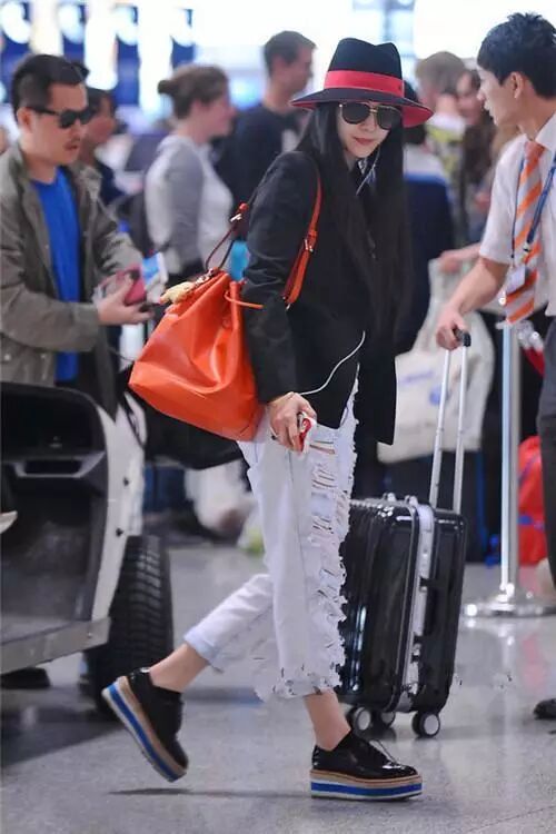 范冰冰机场街拍穿西装外套搭配宽松牛仔裤,很休闲有没有?宽松的牛仔裤也不会显得很胖哦。