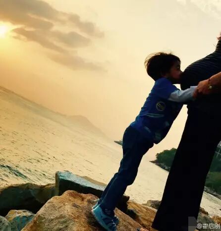 4月12日,霍启刚曾在微博晒出儿子亲吻妈妈肚子的照片,画面温馨幸福。他留言道: