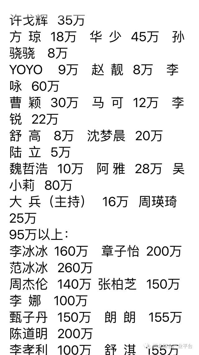 胡 夏 25万 飞儿乐队 38万 伊能静 45万