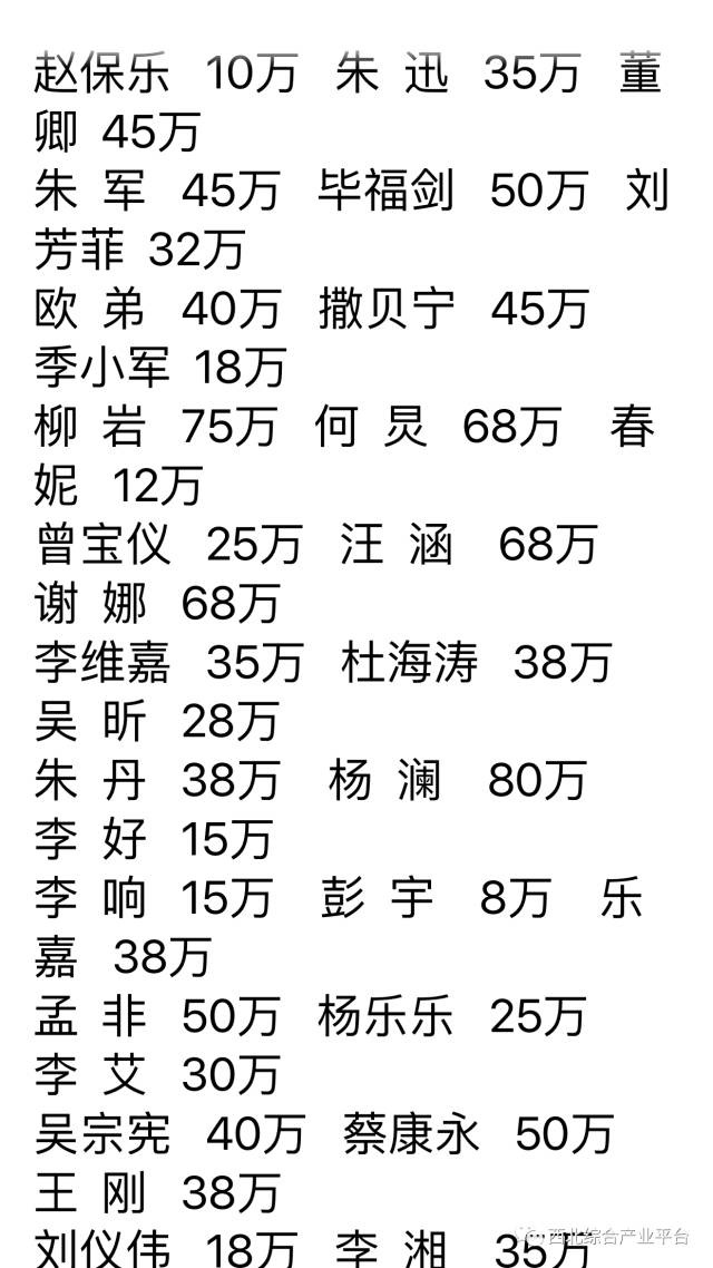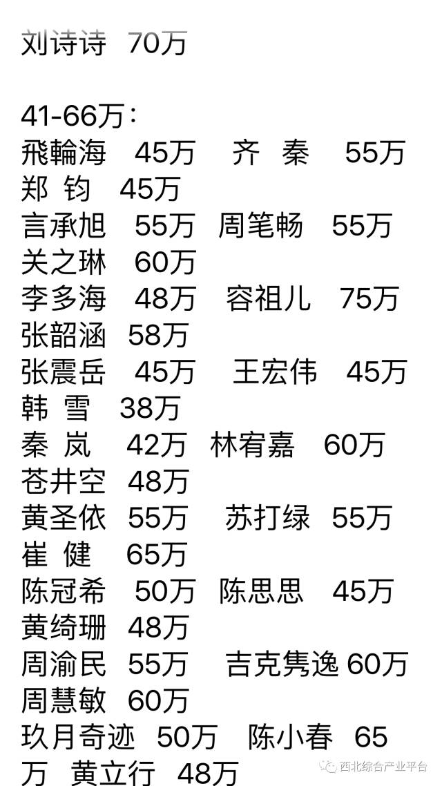 李霄云 10万 李斯丹妮 10万 刘 心 7万
