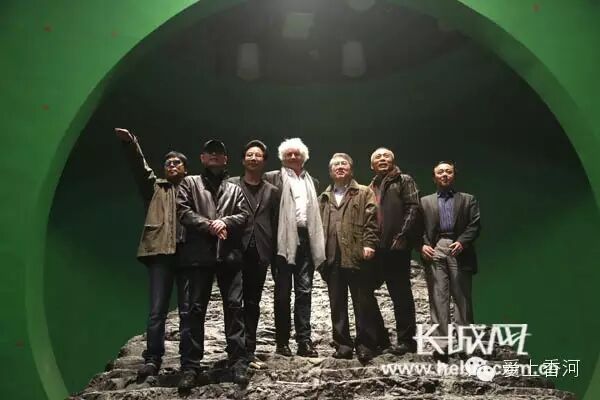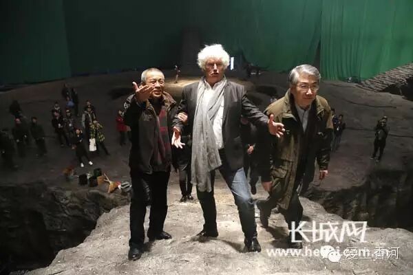 本片监制、法国著名导演让·雅克·阿诺(中),中国电影股份有限公司董事长喇培康(右)、总经理江平(左)登上影片拍摄场景的顶峰,豪情四射。