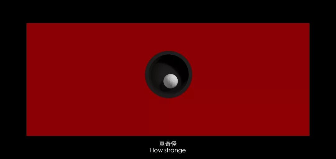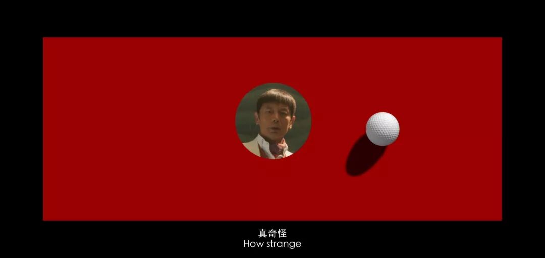 随着歌声不断放大,红色背景开始从四周向中心压缩,直到缩成一个黑漆漆的的高尔夫球洞,画面右侧滚过来的高尔夫球掉入其中,然后跳出片名。