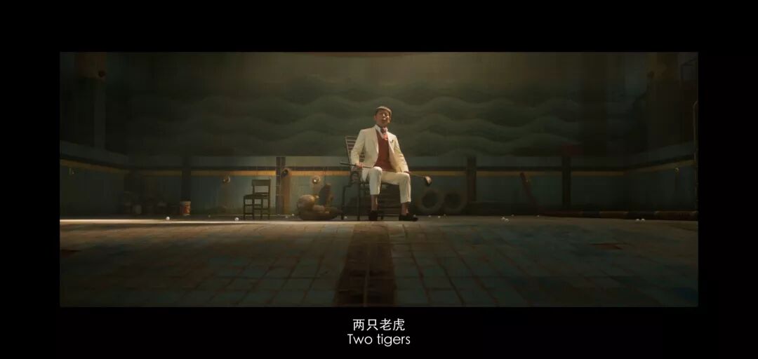 同海报内容相差不多,目前流出的34s先导预告中,镜头缓缓推进,葛优置身于光影晦暗的废弃泳池中,端坐在锈迹斑斑的铁椅上,用美声唱着经典童谣《两只老虎》,脸上还挂着诡异严肃的微笑。