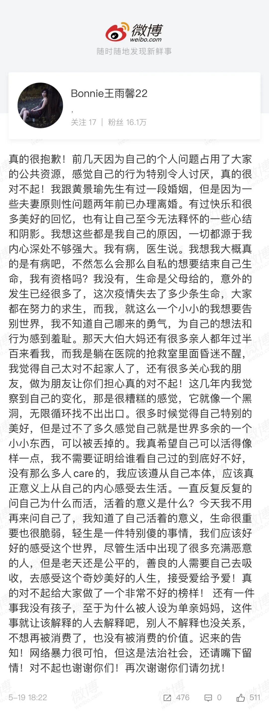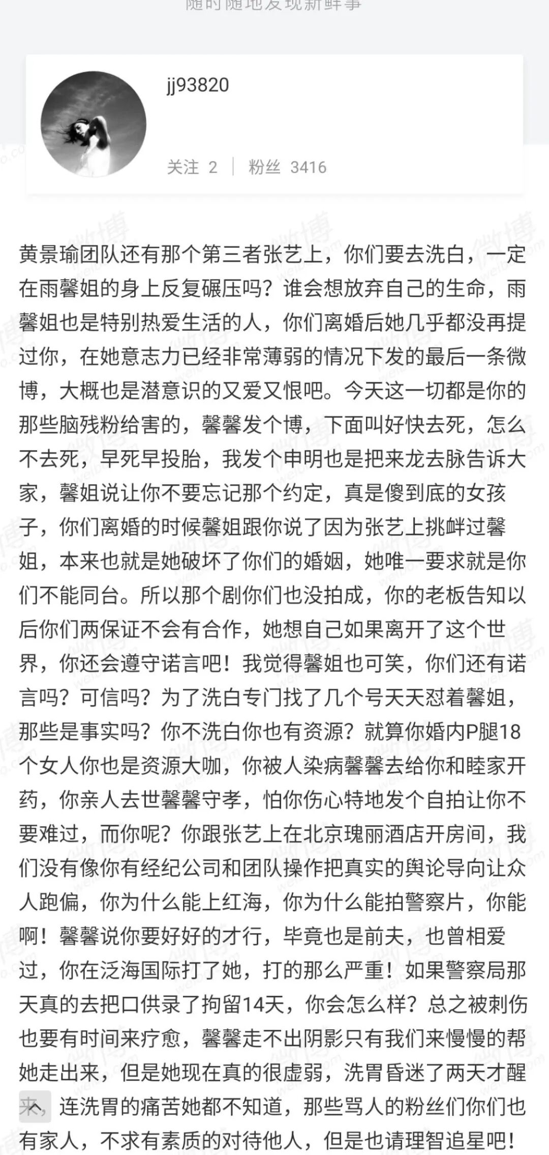 昨天晚上本人在微博上长篇发声,从当事人的角度讲述了两年前已经离婚的状态。两年的时间已经过去,但字里行间里仍能看出这份感情对她整个人造成的打击,仍被抑郁症困扰起了轻生的念头。