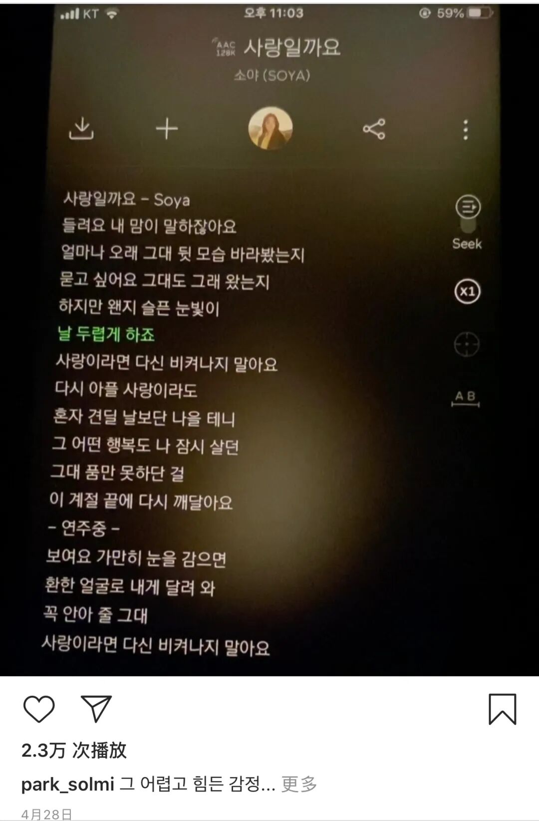 上个月韩国演员朴率美在ins上分享了一首歌,是当年乔妹和玄彬合作的《她们生活的世界》里的主题曲,朴欧尼竟然用了“艰难的爱情啊”作为分享语