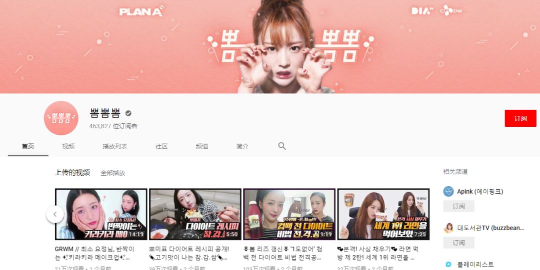 现役爱豆中也不乏有自己的油管频道的人。比如Apink的尹普美,个人频道才开了半年,订阅数已经达到了46万。