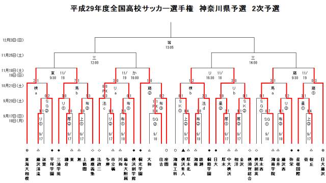 在第二阶段预选赛中,经过6轮单场淘汰赛后,最终决出一支球队代表神奈川县参加全国大赛。目前本届神奈川县预选赛已产生8强,县预选赛决赛将于12月3日进行。