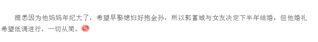郭富城今天之所以选择结婚,公开喊话过,是因为妈妈觉得年龄太大,要抱孙。