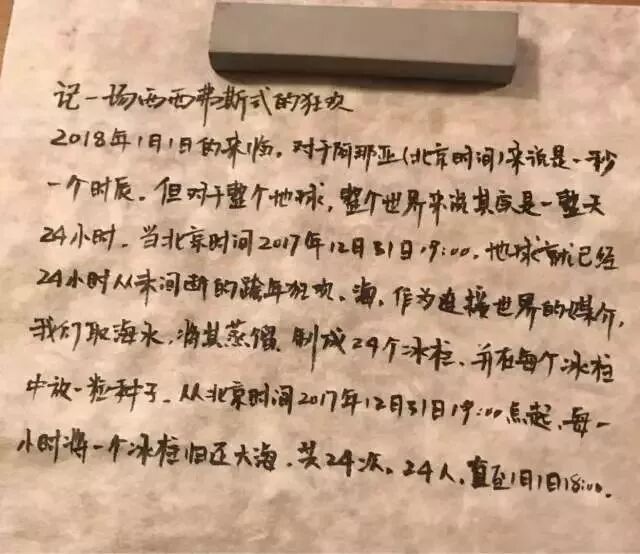 与此同时,孤独图书馆里也进行着一场“西西弗斯式”狂欢。2017年12月31号晚上7点,孤独图书馆的员工从海水中取水蒸馏做了24个冰块,每个冰块中放一粒种子,每到整点就把一块冰块放回大海。每粒种子也是不同的,有银杏、广玉兰、女贞与白玉兰等等,这个过程将一直持续到第二天晚上七点。