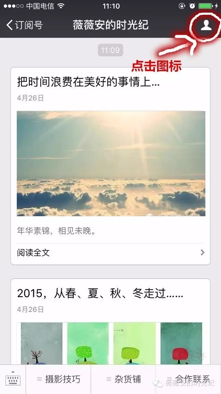 1.进入“薇薇安的时光纪”公众号,点击右上角的白色小人图标。