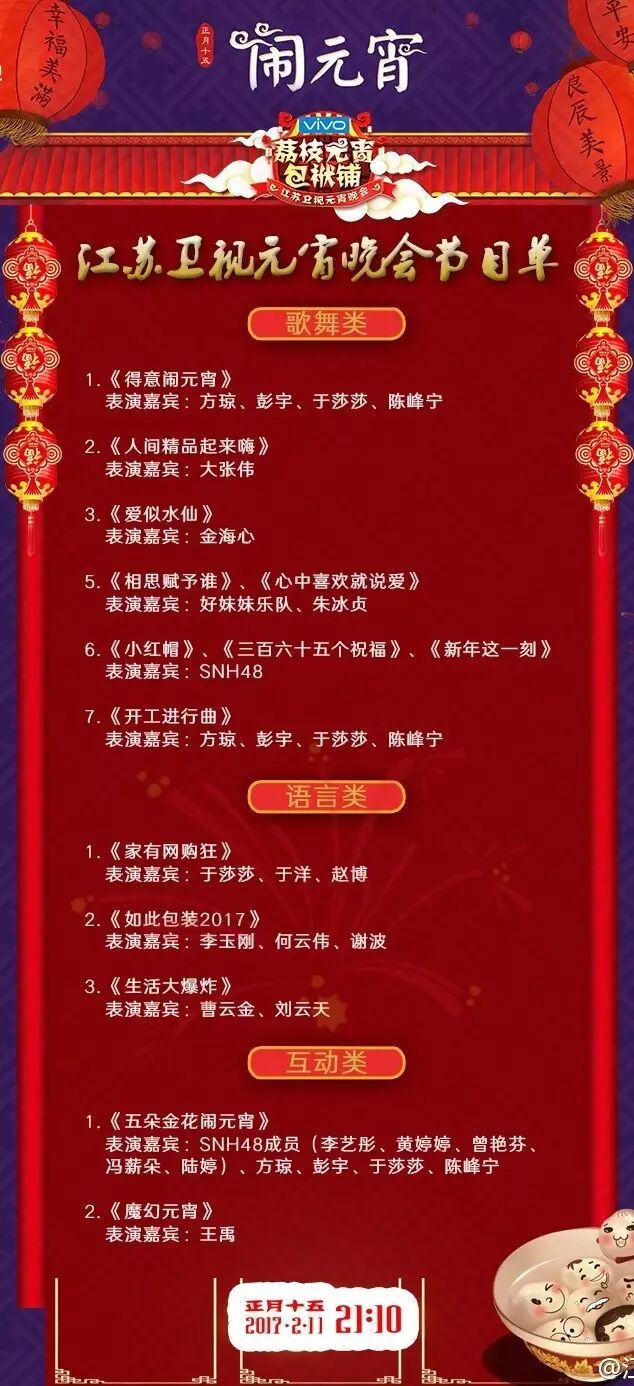 嘉 宾方面,今年的湖南卫视元宵喜乐会请来了李小璐夫妇、蒋劲夫、大张伟、何洁、林志炫等等,人气演员蒋劲夫将搭档”陈娅安,为大家献上一首甜蜜蜜的《告白气 球》。而在最新一季的《歌手》中杀出的一匹高音黑马——哈萨克斯坦国宝级歌手迪玛希,也在嘉宾名单中,也将是元宵喜乐会的一大看点。