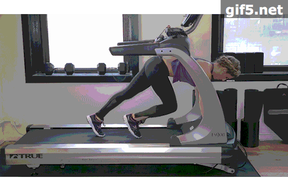 动作 5:暂停跑步机,双手按在跑步机马达罩上。双脚向后蹬踩跑带。背部伸直,肩膀位于腰部之上,臀部下压。持续这个动作 2 分钟。