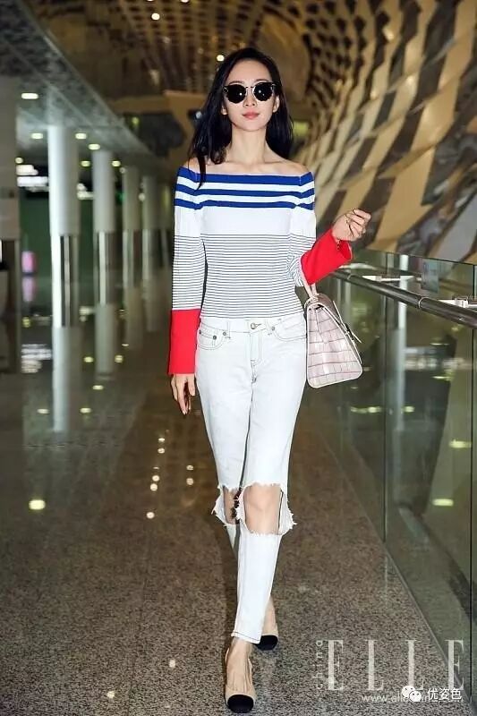 王鸥的腿型真的是无可挑剔,不然也不敢穿这条浅色的破洞牛仔裤,搭配针织露肩上衣,脚上穿的是Chanel的高跟鞋,优雅时髦。