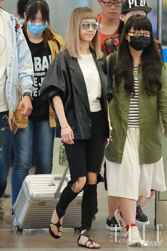 蔡依林这条黑色破洞也很百搭,搭配白色T恤和黑色皮衣,整体look很好地呼应了,脚踩黑色凉拖,简单时尚。