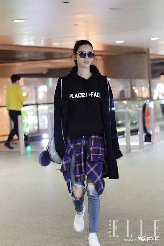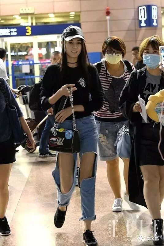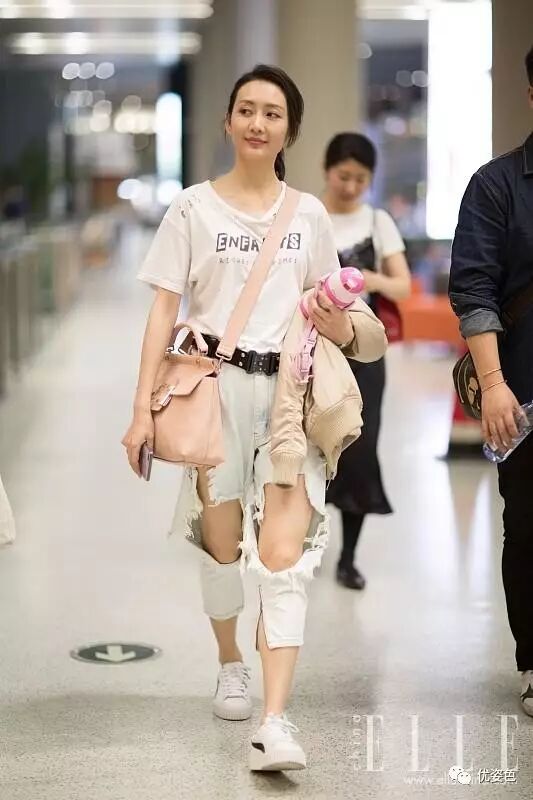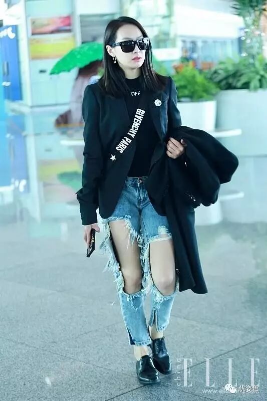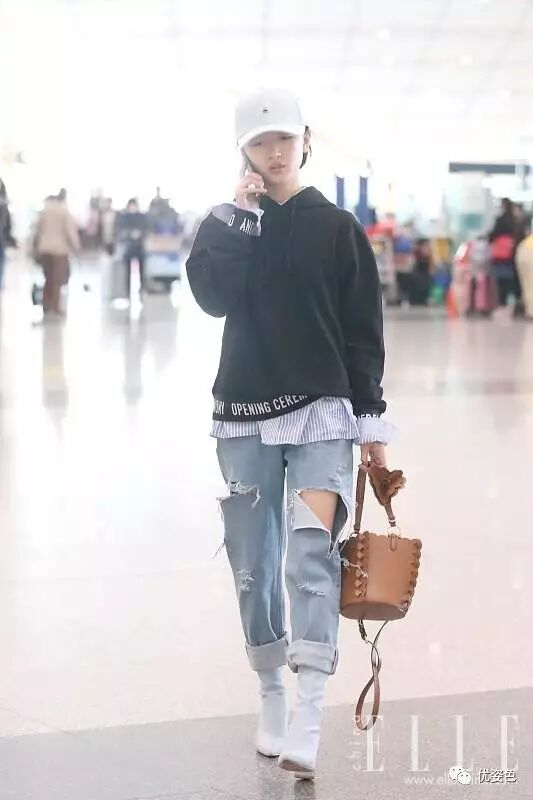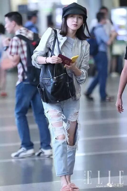 刘诗诗的街拍里也少不了破洞牛仔裤,相比前面几位,这个洞那破得是相当矜持了,搭配条纹上衣和黑色棒球外套,脚踩小白鞋,简约时尚的风格果然很刘诗诗!
