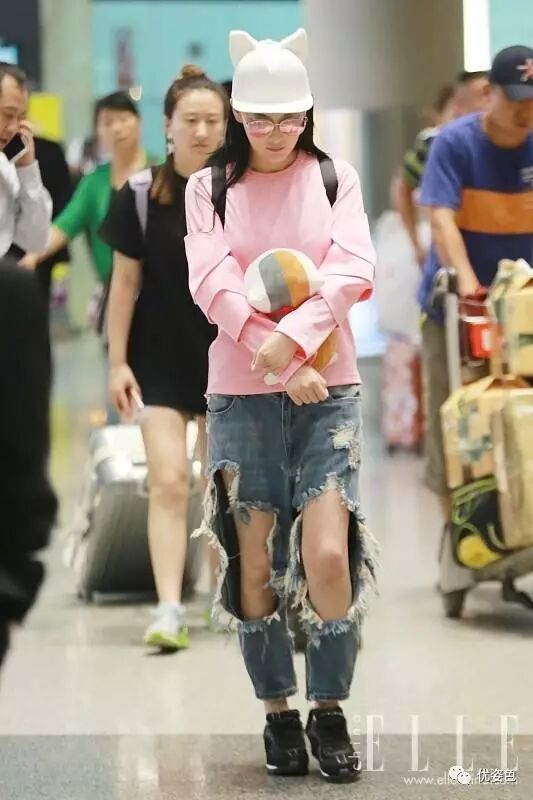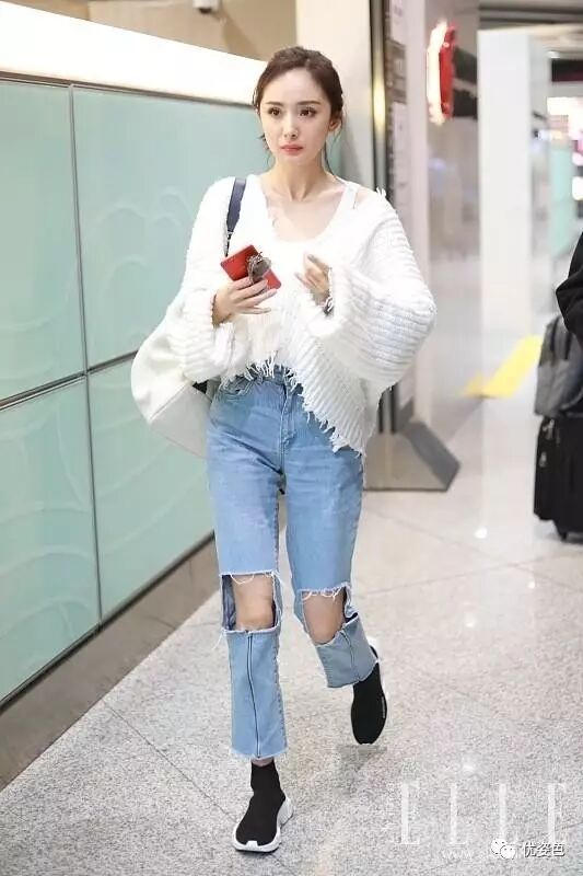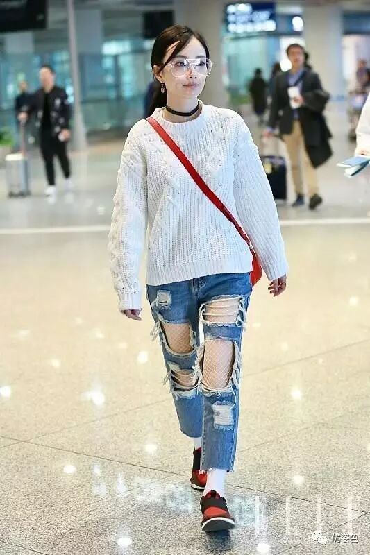 李小璐最近的街拍最出名的就是这个吧,不止两个破洞的牛仔裤,里面搭配白色网袜,和白色的毛衣呼应,脚上一双亮色的运动鞋,很有活力的感觉